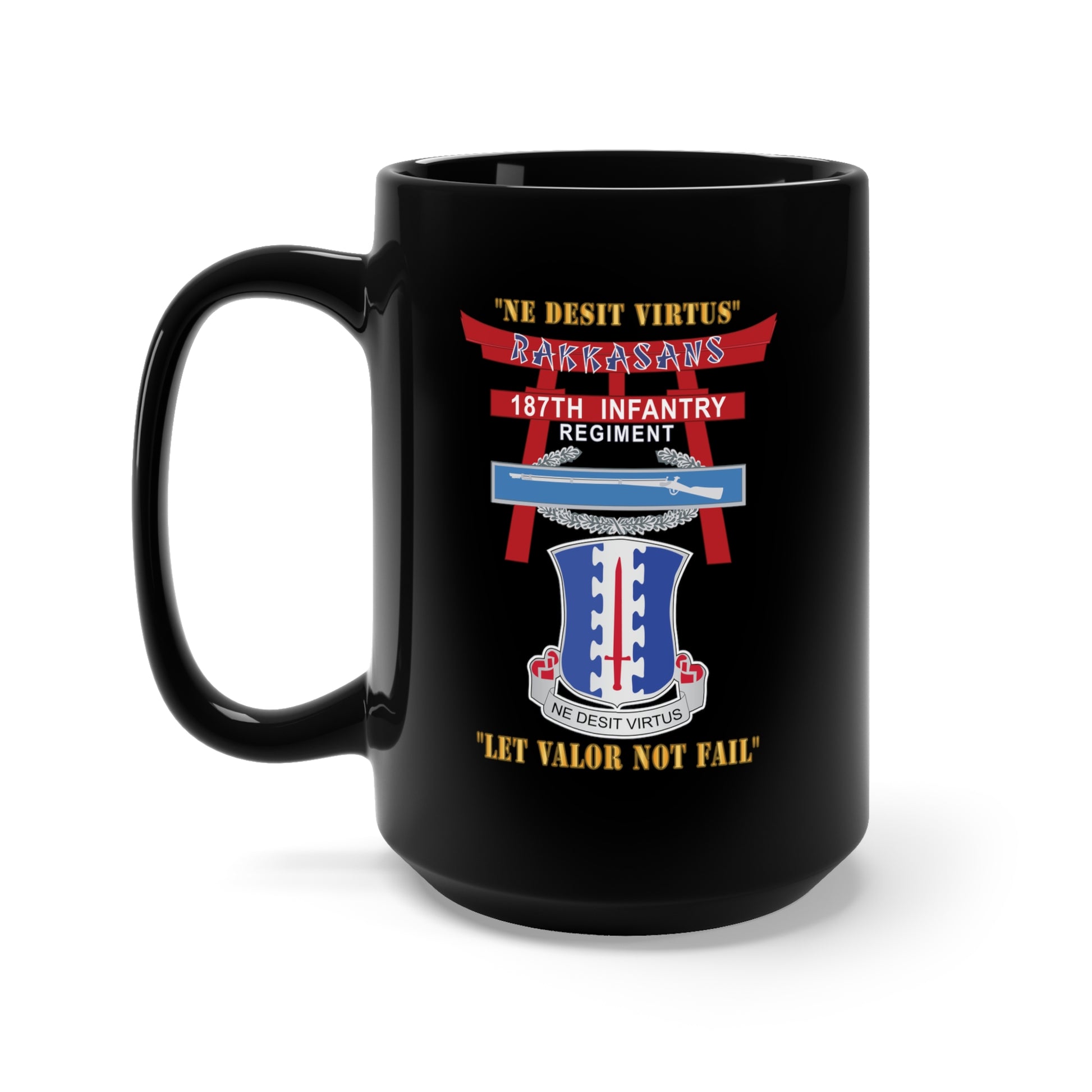 Black Mug 15oz - Army - 187th Infantry Regiment - Torii, Rakkasans, Let Valor Not Fail, English, Latin w CIB X 300