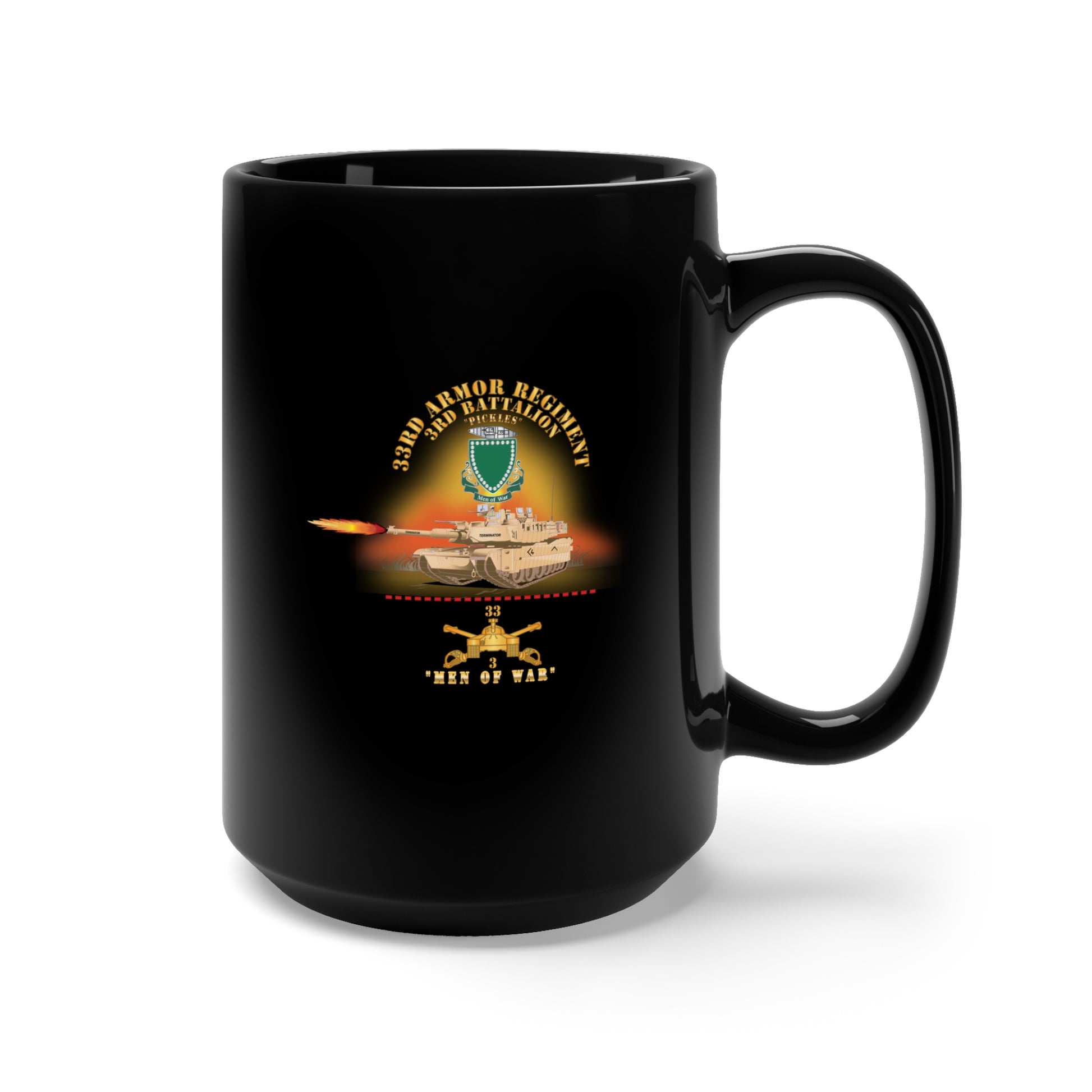 Black Mug 15oz - Army - 3rd Bn 33rd Armor Branch w 33rd Armor PICKLES DUI - MEN OF WAR w Fire - Shirt X 30