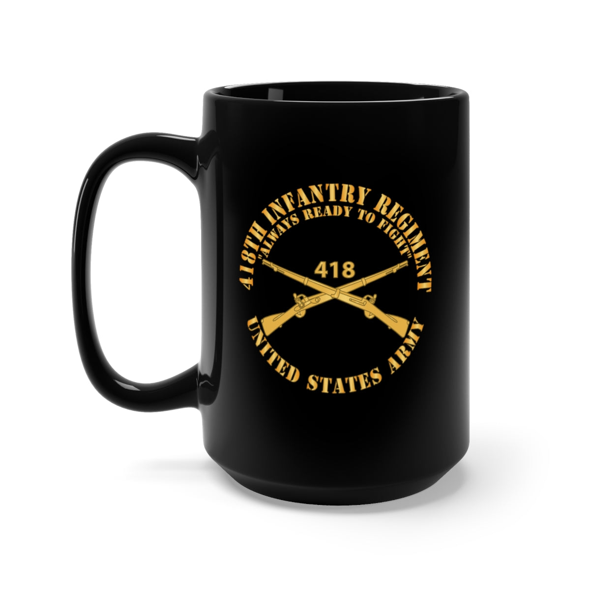 Black Mug 15oz - Army - 418th Infantry Regiment - Always Ready to Fight - US Army w Branch X 300