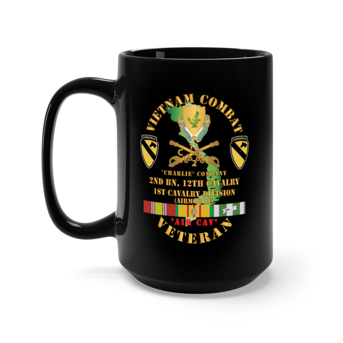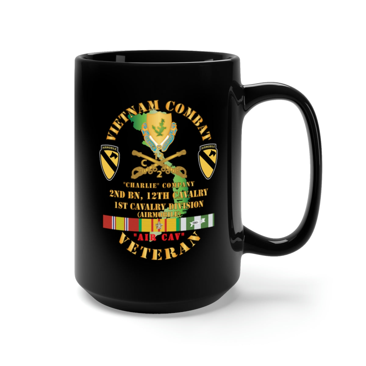 Black Mug 15oz - Army - Vietnam Combat Cavalry Veteran w C Company 2nd Bn 12th Cav DUI - 1st Cav Div X 3000