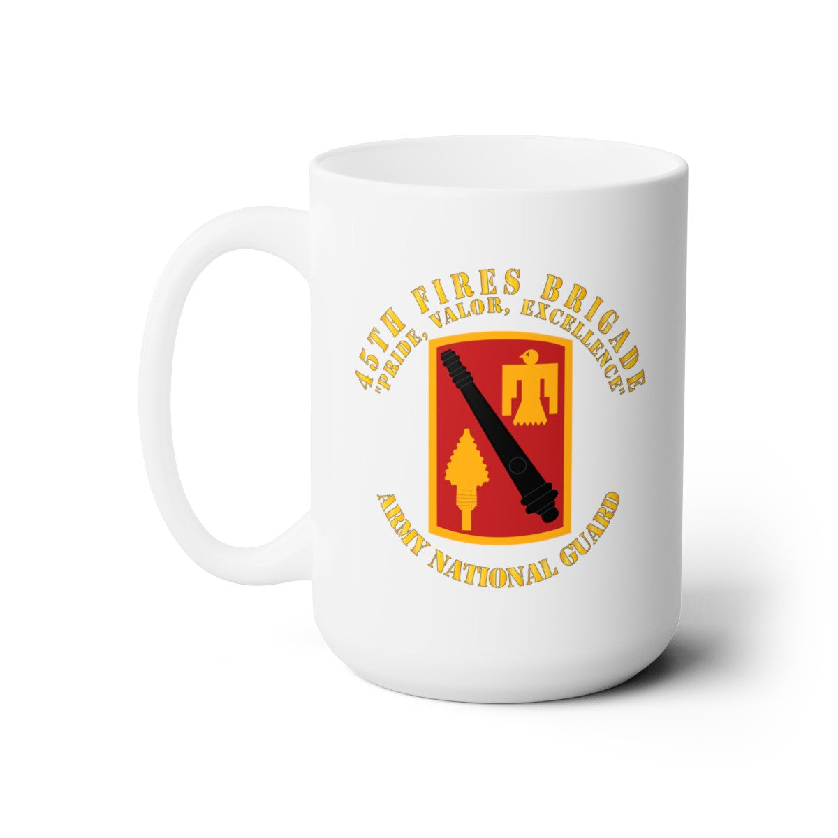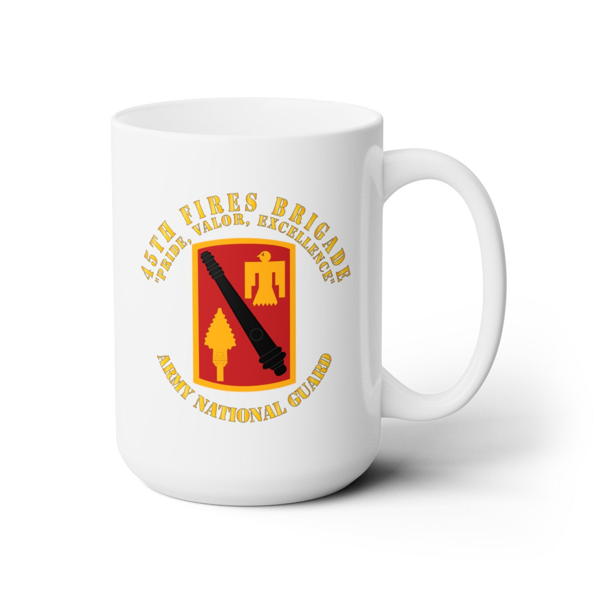 White Ceramic Mug 15oz - Army - 45th Fires Brigade - Pride, Valor, Excellence - SSI - ARNG